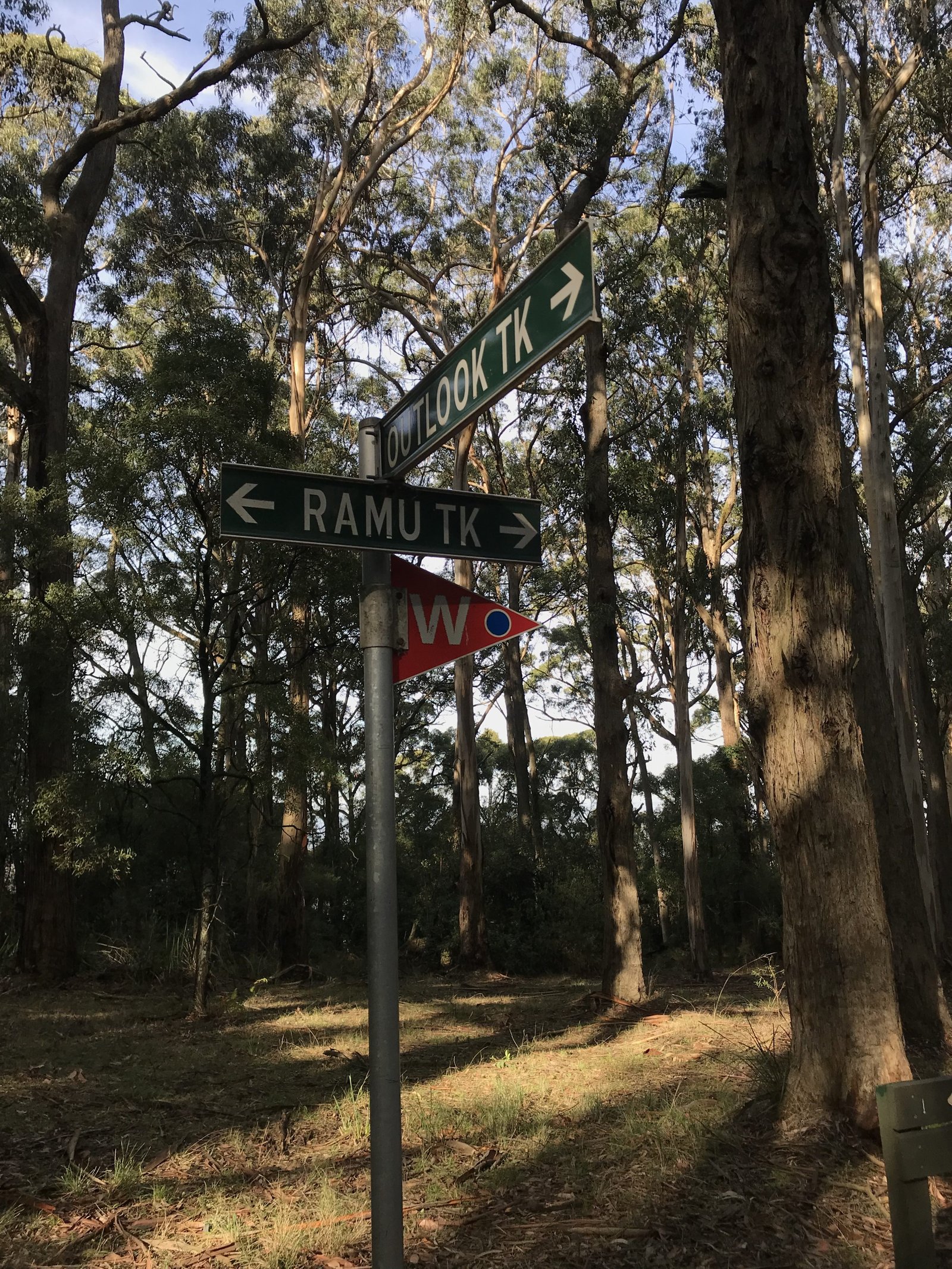 From here there are other trails that you can walk which you can find on www.visitdandenongranges.com.au . I am doing a circular walk today so leaving the seating area I walk 20 metres and turn left on a track which will take me left down onto the Ramu Tk. Continue down hill on this well maintained wide track until you reach Belview Tk. Keep veering left downhill. As you walk downwards it is a lovely undulating trail through the magnificent gums. Sometimes the odd kangaroo but not today.
